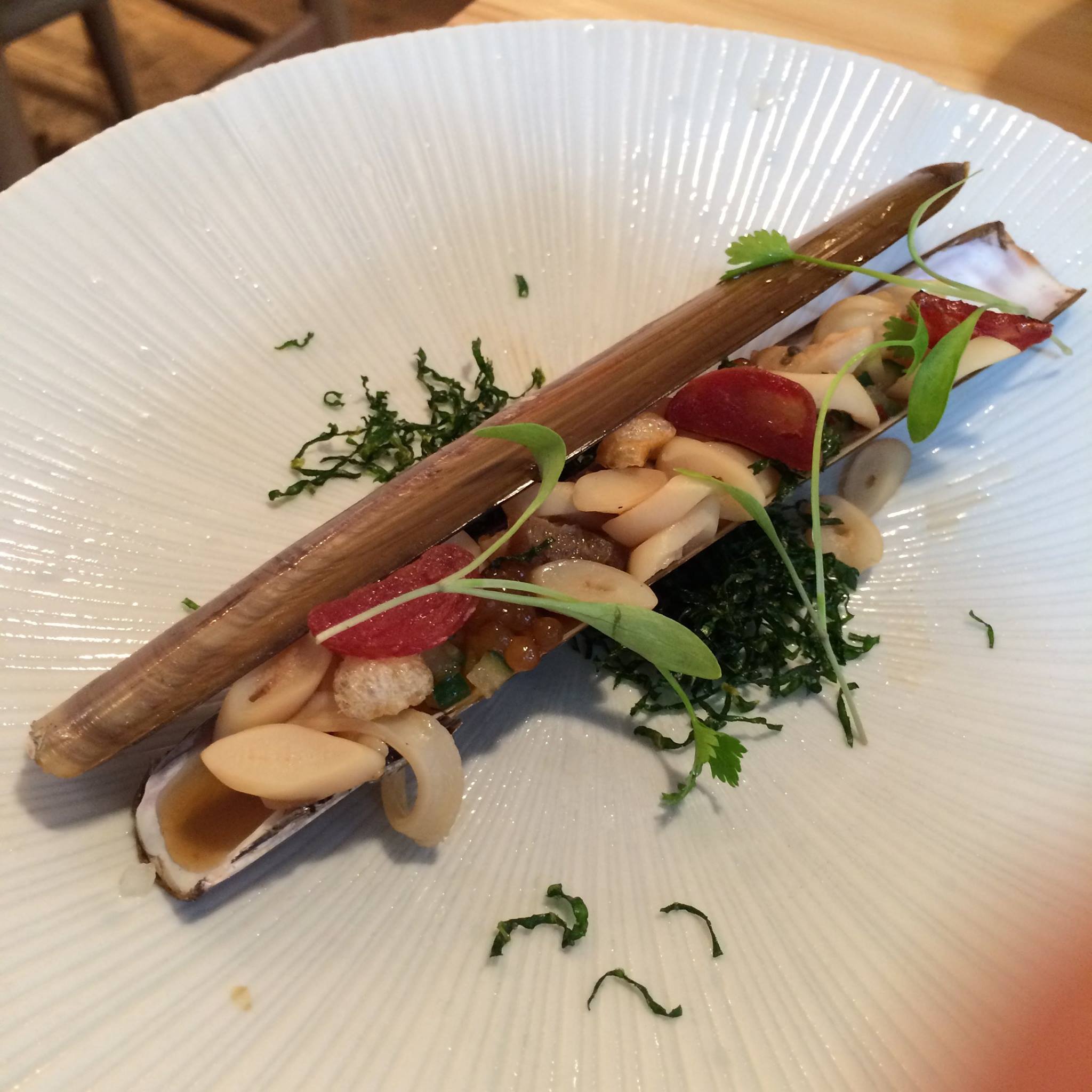 10648299_341160756053886_68913285877234657_o October 14, 2014 2048 × 2048 A. Wong – the extraordinary Chinese Razor clam with braised sea cucumber, pickled cucumber, wind dried sausage