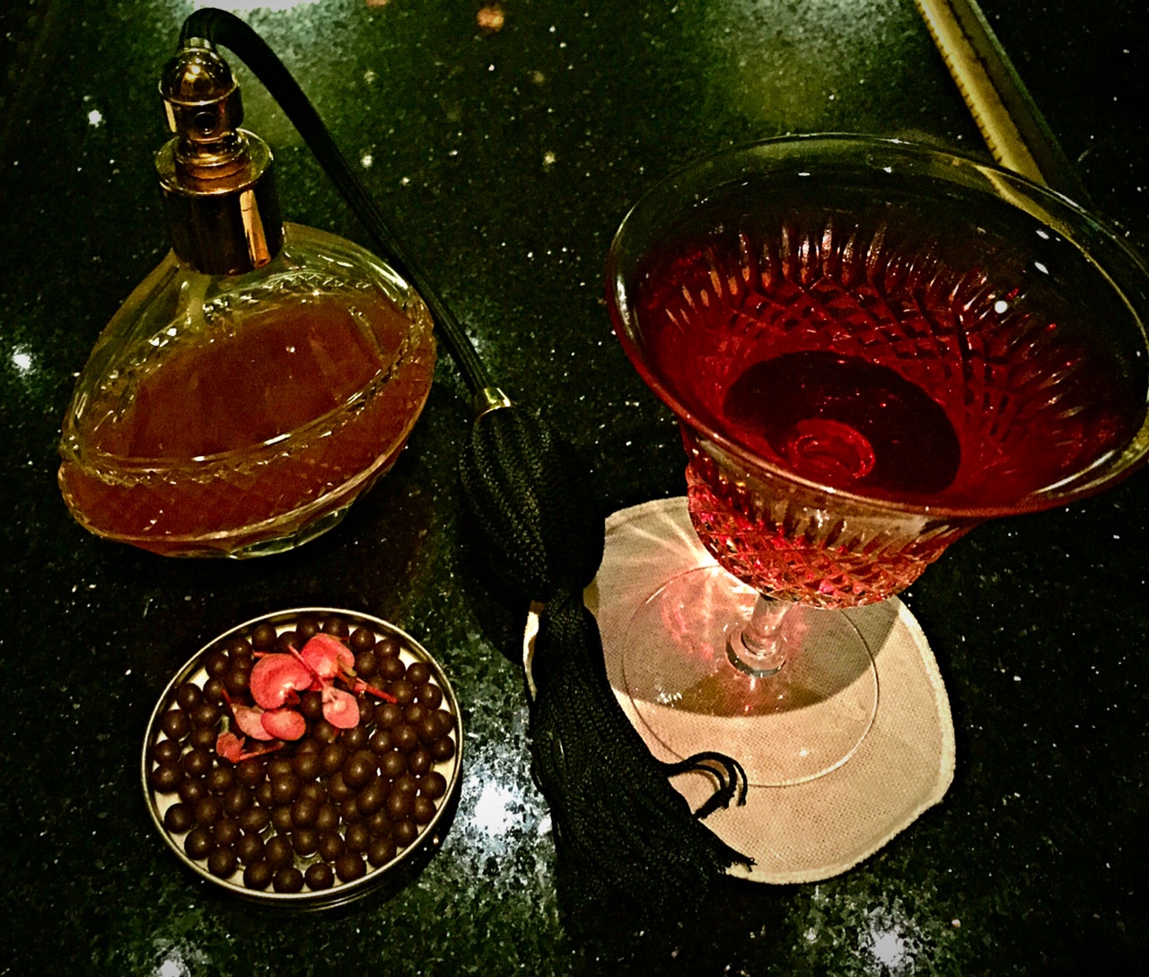 Frankly speaking, they had me at Chateauneuf-du-Pape reduction. I was just too curious to try a cocktail that contains a red wine sirup and also tempting – vintage champagne. They say Chateauneuf-du-Pape was Madame Chanel’s favorite wine and she always had it with fish caviar which she also loved – good call to replace it with chocolate caviar to go with the cocktail. (CNDP and fish caviar must have been a terrible food and wine pairing!)