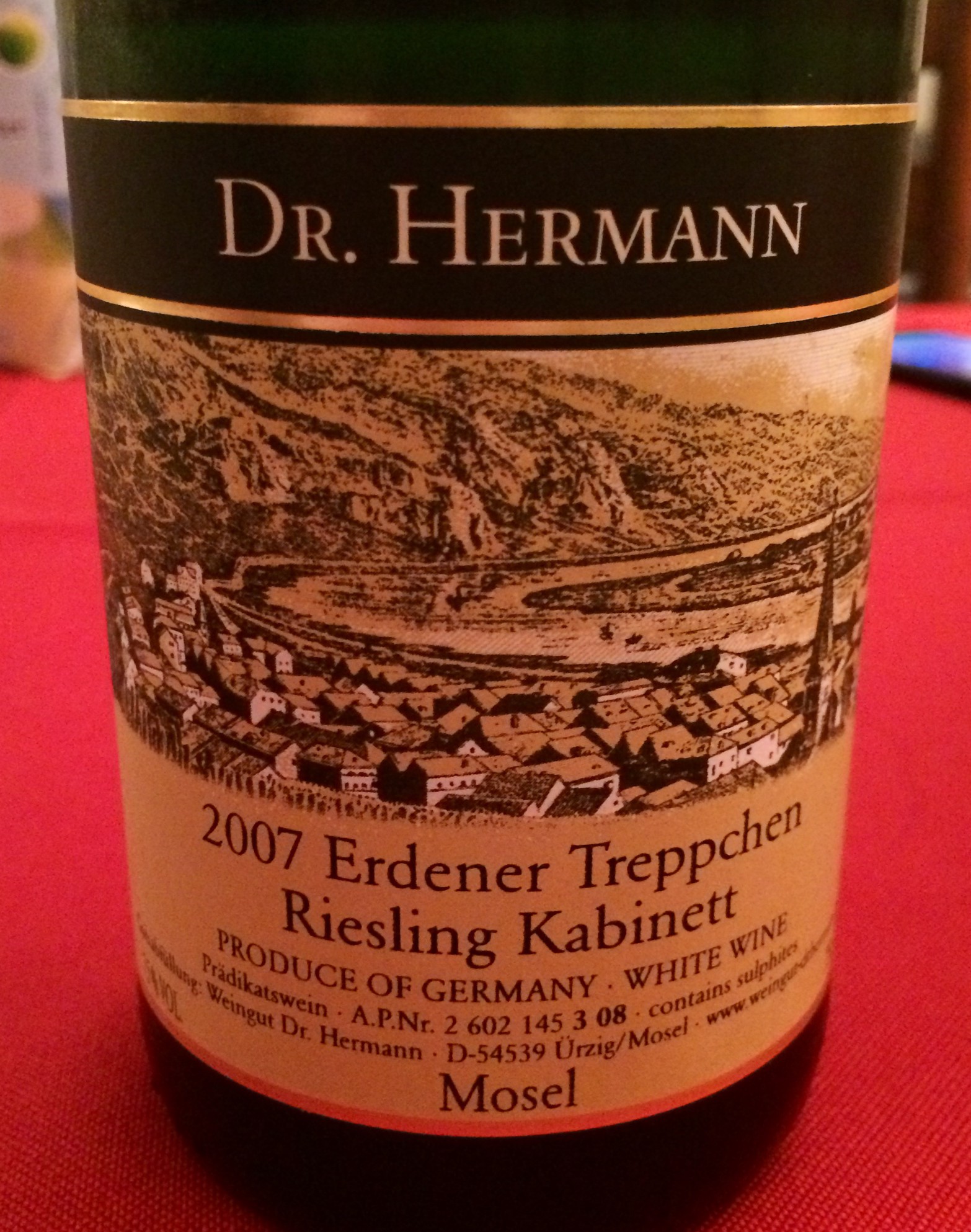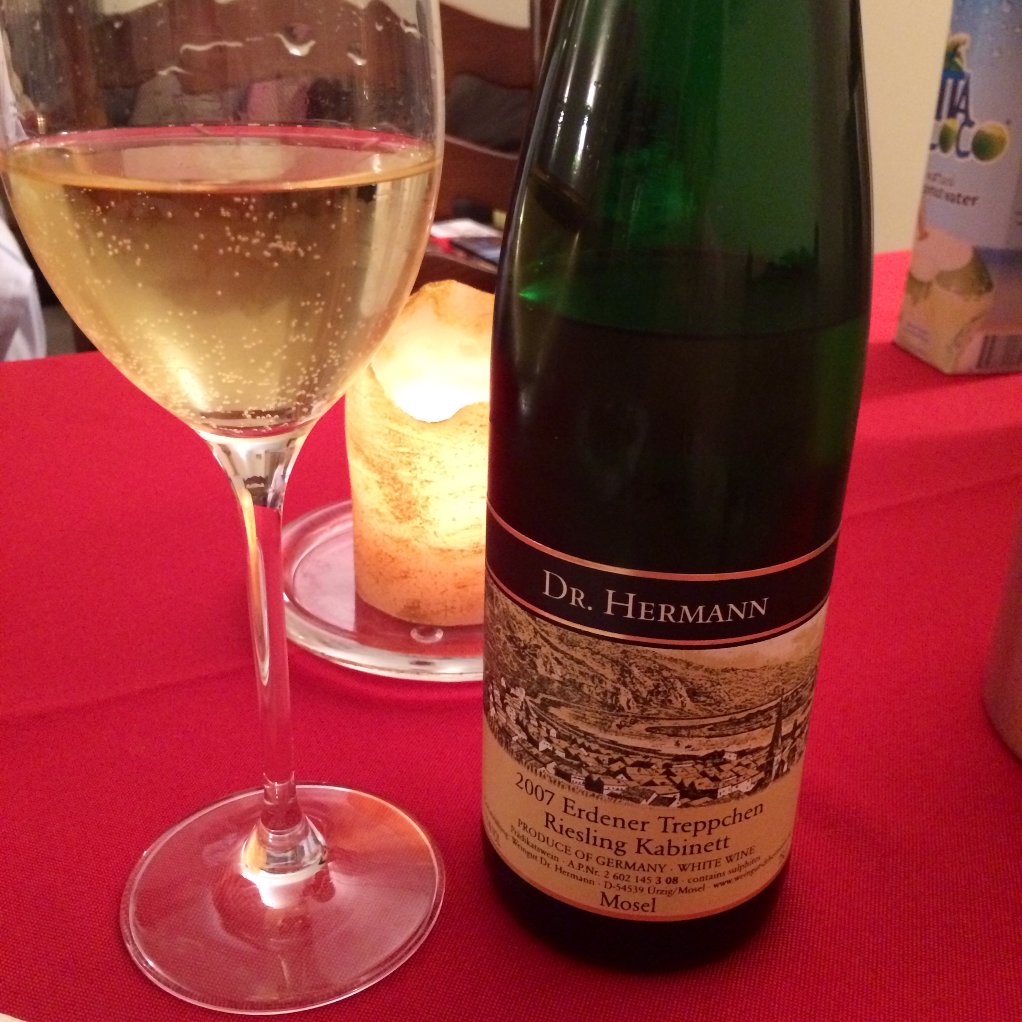 DrHerrman1Now to the wine: I like German Rieslings a lot. They are often very good value for money,  most are very good quality (like anything made in Germany really) and even if they are on the sweeter side, their mouthwatering high acidity levels make them very easy drinking wines.