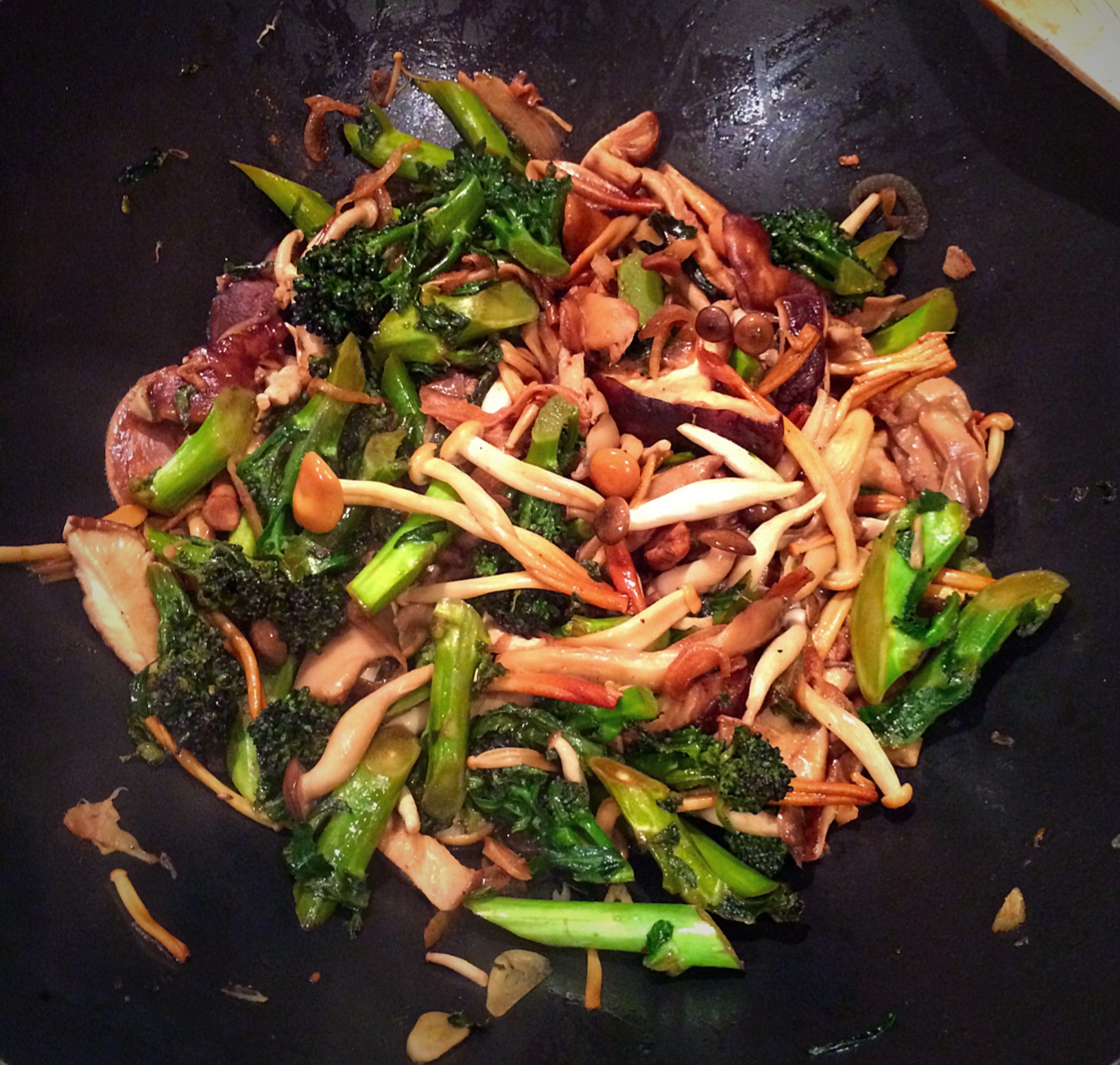 photo 3Also, I added garlic and purple-sprouting broccoli to the veggies. Broccoli need to go into the wok first as they take longer to cook than the mushrooms. Very unusual for me not to have fresh ginger at home but the problem was solved quickly with little leftover packs of pickled ginger from the Japanese takeaway (never despair when you’re lacking an ingredient, there is almost always a way to deal with it 🙂 )