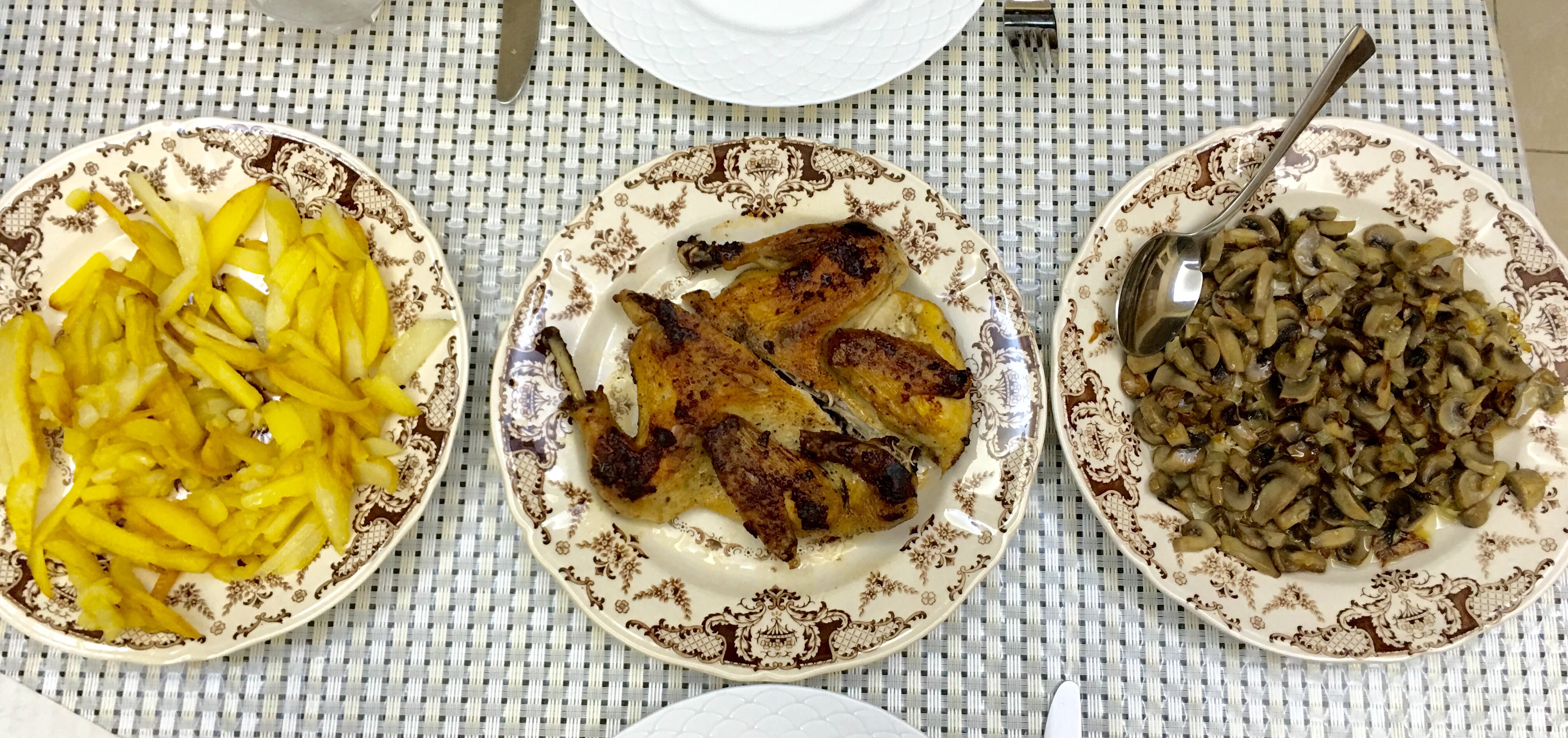 img_3658 September 19, 2016 4032 × 1899 Azerbaijan – the Land of Fire, Food, Wine & UNESCO World Heritage Tabaka chicken (baby chicken pan fried flattened under a weight) with sides of pan fried potatoes and mushrooms
